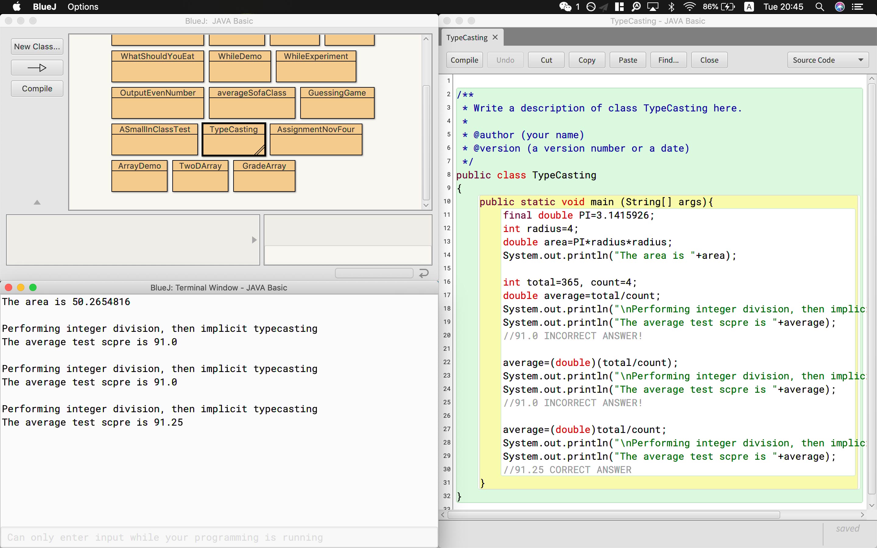 This first concept we learnt was type casting. The basic syntax of this expression is (datatype)(expressions). However, if the expression is consisted of only one variable, the parenthesis around it is optional. For example, in the following exercise, only the last form can run.