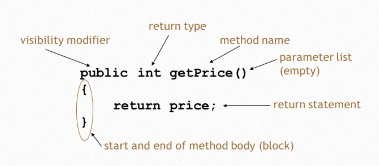 Actions that an object can take are called methods. It’s the final important concept in OOP. For example, we can change the color, size, position of the circle in the in-class activity, and all those behavior are called methods. They have headers and body parts, and contains declarations (to create additional, temporary variable spaces) and statements (to describe the actions of the method).