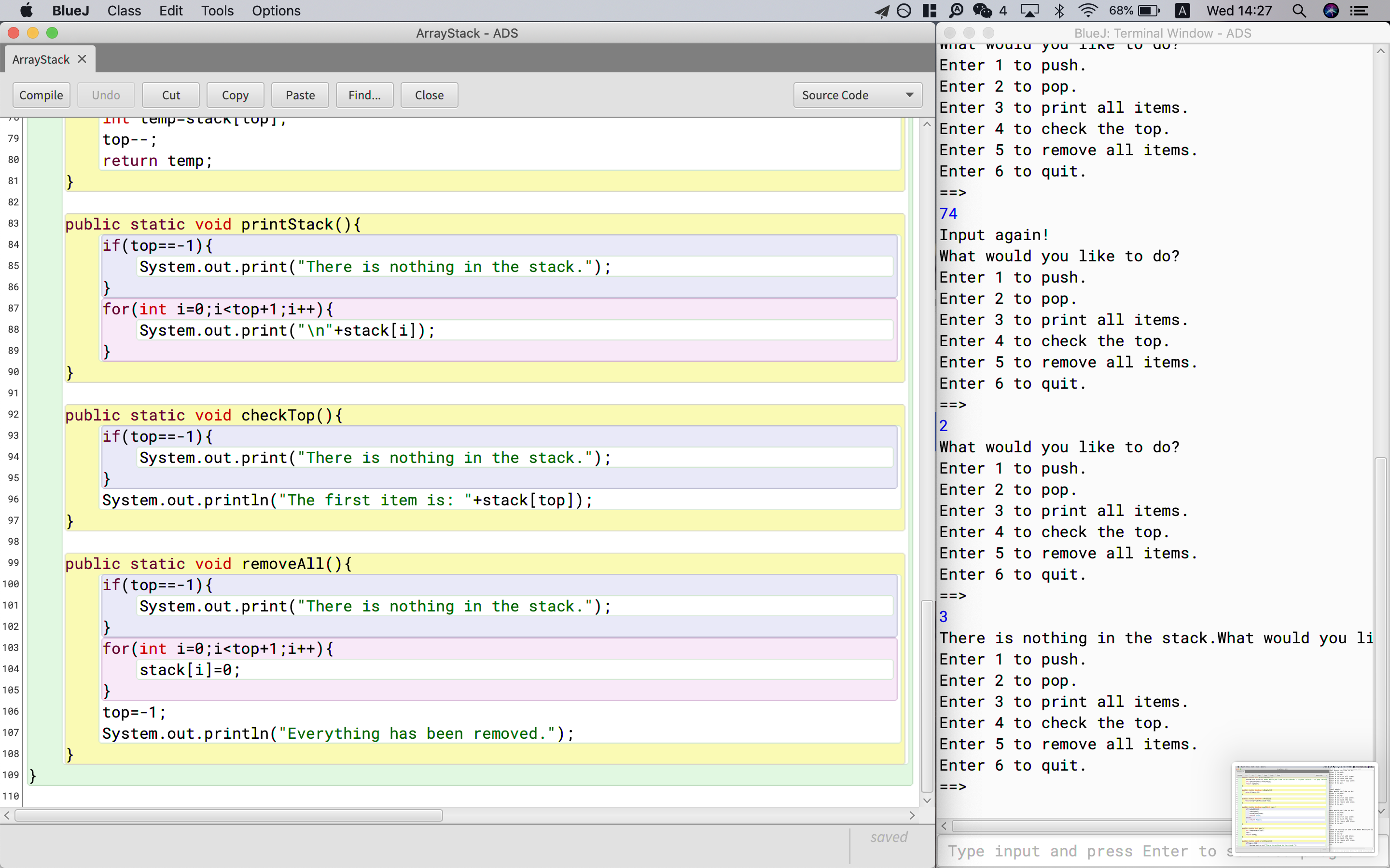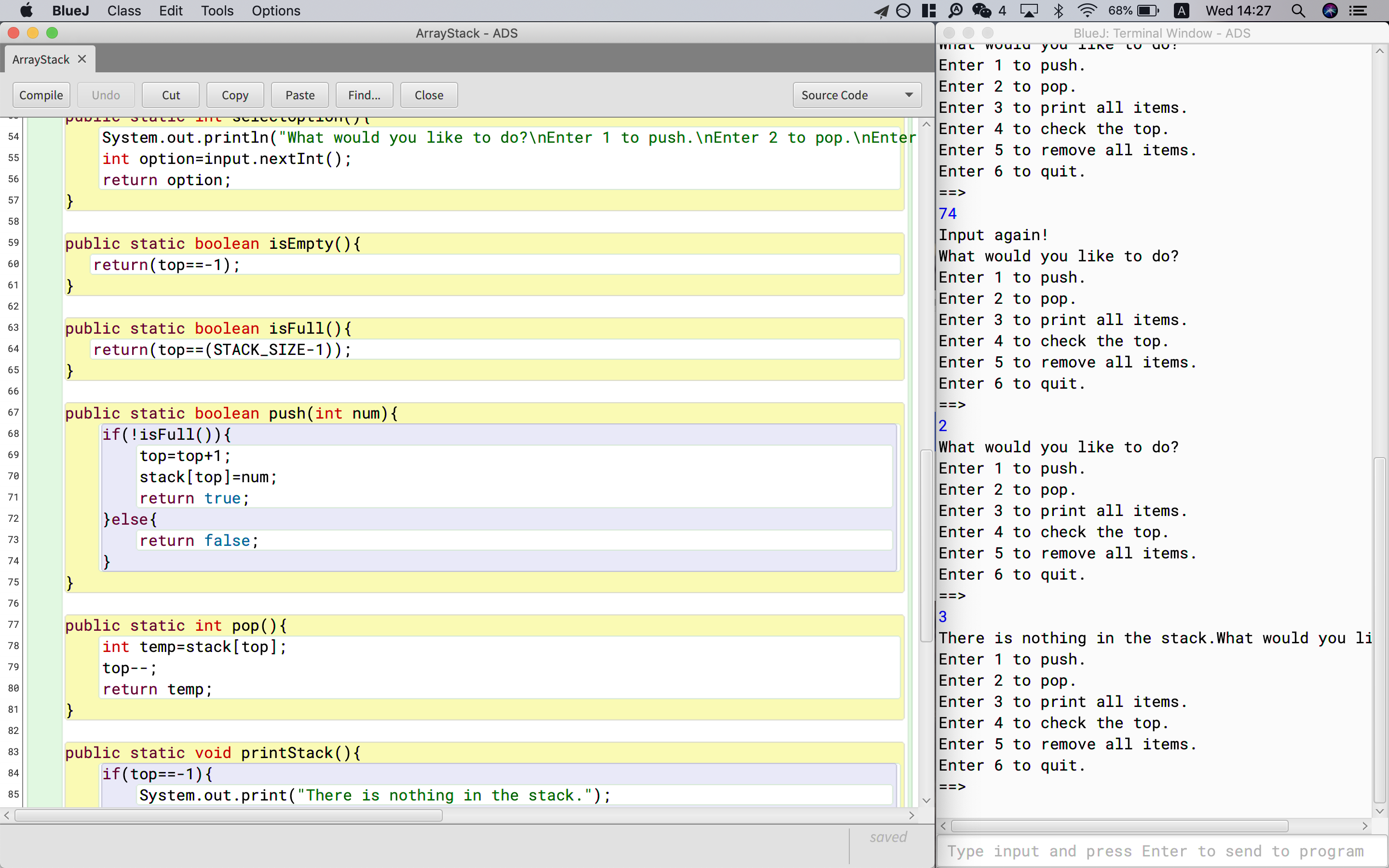 There are three method in stack: push, pop and isEmpty; which means, we can do these three manipulation to a stack. Pop is to add an element to the top of the stack; push, on the other hand, is to remove it. IsEmpty is to check whether the stack is empty. If it is, the method would return “true”.
