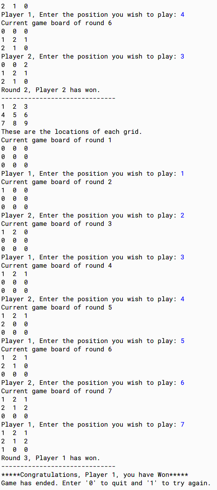 The Tic-tac-toe Game Program is a program created by Tenny, Annie and Bryan. User can play tic-tac-toe game on this program by inputing which position (from 0 to eight) they want to place their chess pieces. The system will automatically calculate the score of each player and judge whether each round is a tie or not, or which team wins. We use 0 to represent blank space, 1 for pieces by player 1 and 2 for pieces by player 2.
