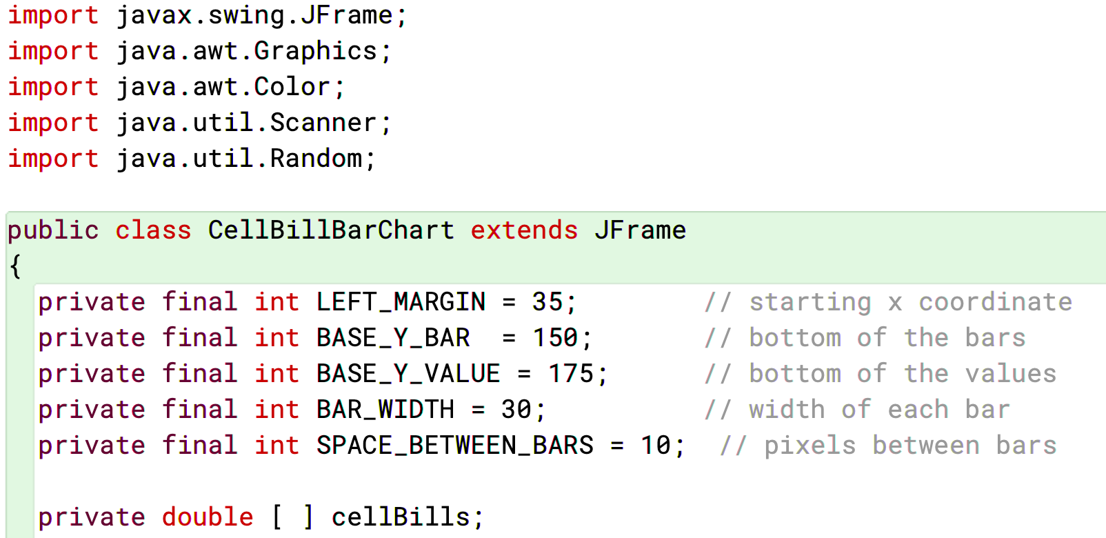 With these basic skill, we can do further expansions, like drawing a bar chart with rectangles and texts, while reading data from an array. A bar chart is basically composed of several rectangle with same bottom lines and width, but different height. To achieve this, we have to use a loop, with several integer variables predefined: the width of the boarder, the width of each bar, and the distance between every two bars. Because the size and position of a rectangle is defined by four variables (starting point at x-axis, starting point at y-axis, width and height), so its starting points at x and width can be defined by a loop that includes the number of bars, the boarder value, the distance and the width. Its height can be defined by the data in the array. Finally, to randomly change the color of each bar, we can use a random color generator within the loop, before each bar is drawn.