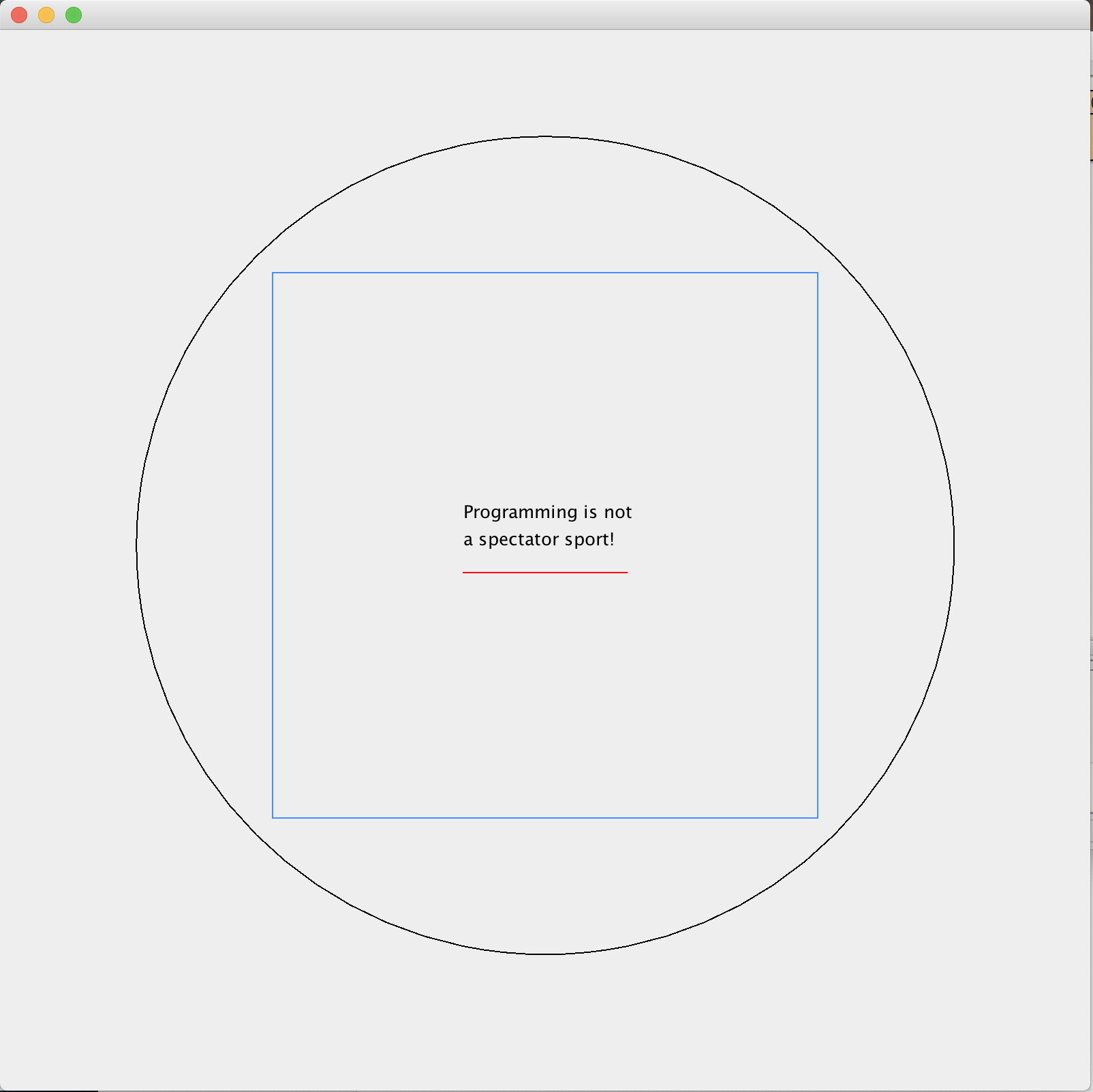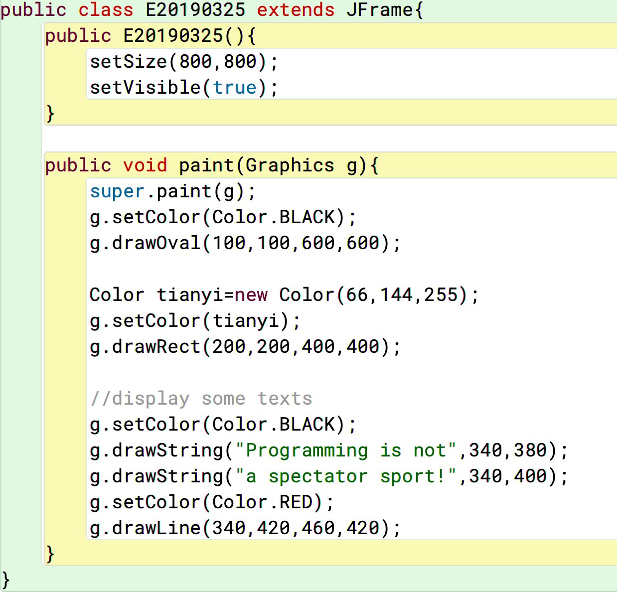 The first concept we learn is Graphics class, which provides methods to draw shapes (lines, rectangles, ovals), text on the window and set colors. The main body of the codes is basically constructed of “pubic void paint (Graphics g){super.paint(g);}”. Inside the {}, we can write out codes. Two basic methods are draw and fill; the former one draw the outline of a shape, while the latter draw the shape with colors filled.