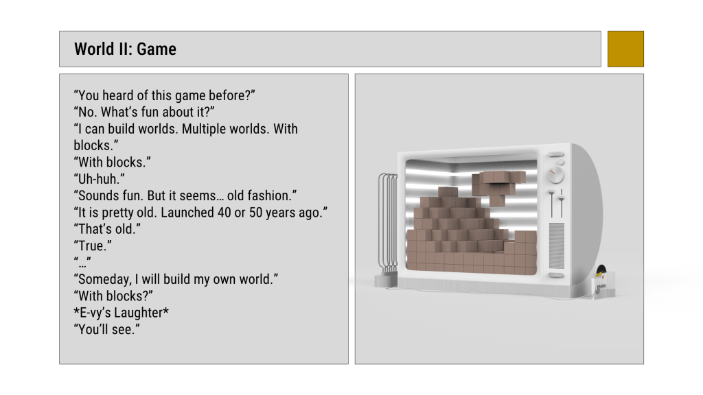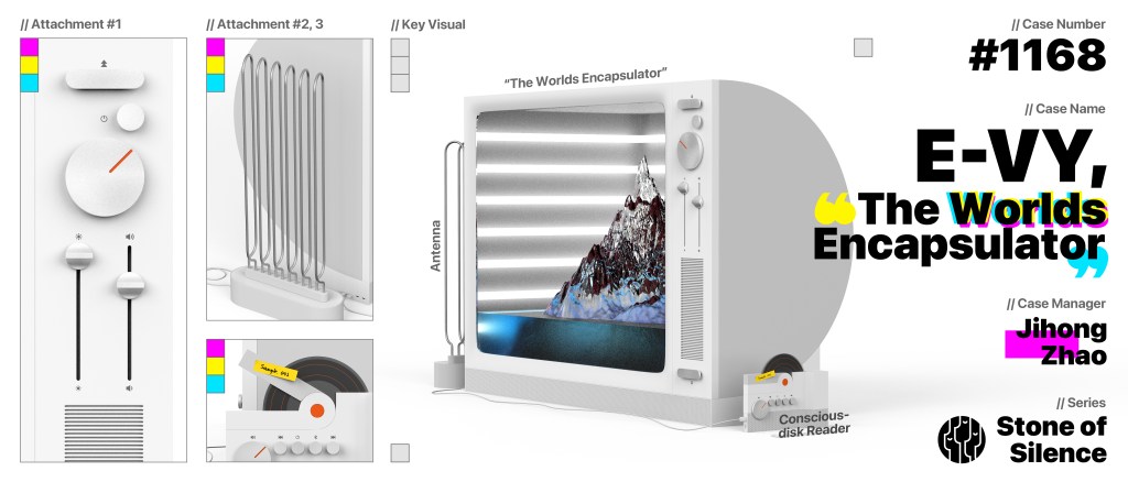 This project was developed in class “Sci-fi Prototyping”, aiming to combine product design and storytelling. The story emphasizes the conflict between technological advancement and ethics. “The Worlds Encapsulator” is not only a product design of a TV but also the key item of the story, which holds the consciousness of the main character, E-vy. The visualization is created in Blender.