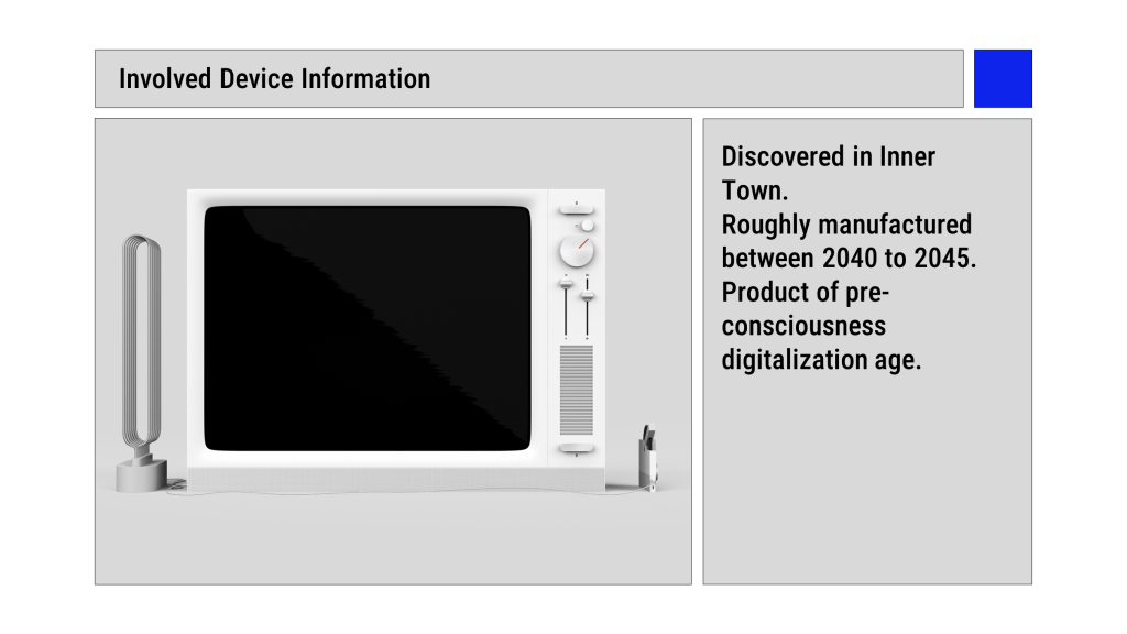 To further emphasize the narrative aspect of this prototype, I added details to make the TV looks like an item in the movie. The sticky notes with “Sample 041” suggests that the subject has iterated the machine multiple times; the 6 antenna rings suggest that the TV was used in a remote location where signals are weak; the iceberg on the screen shows the pictures in the subject’s childhood memory.