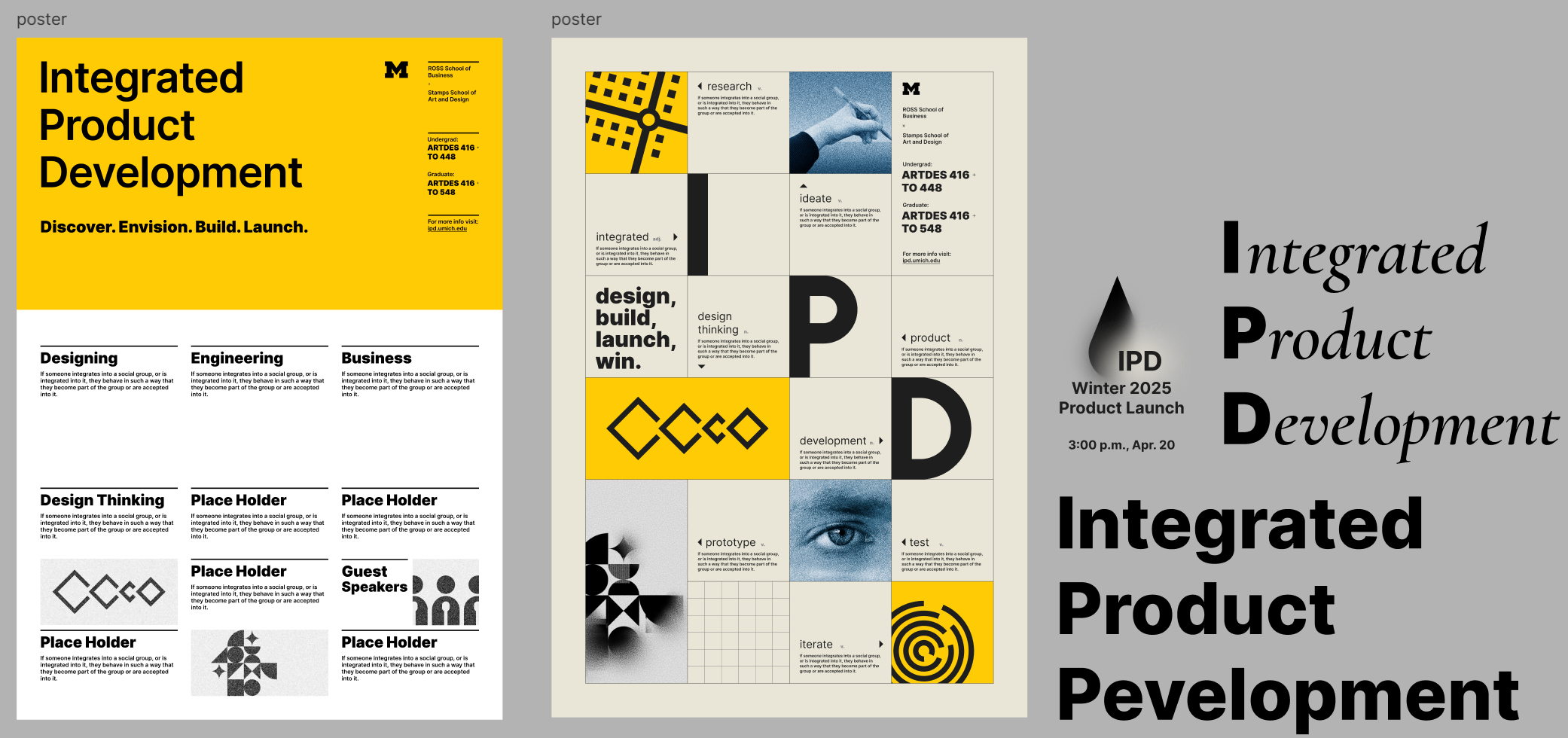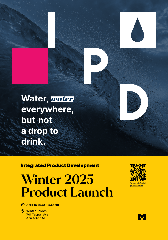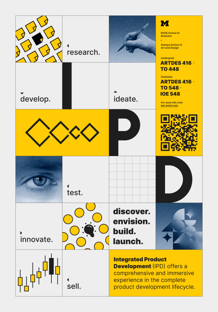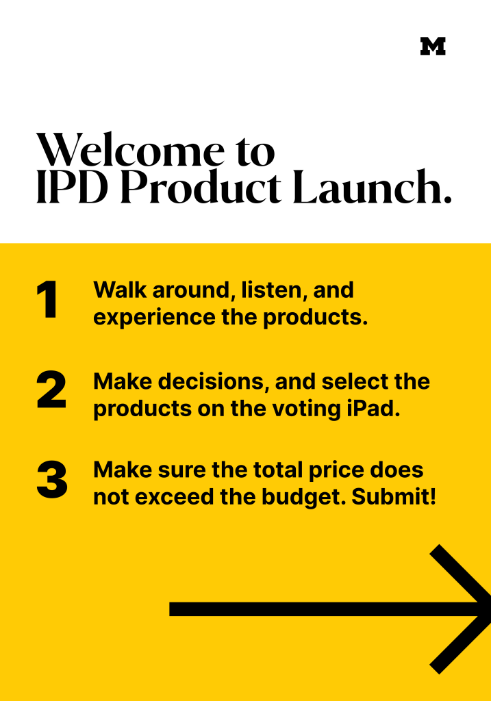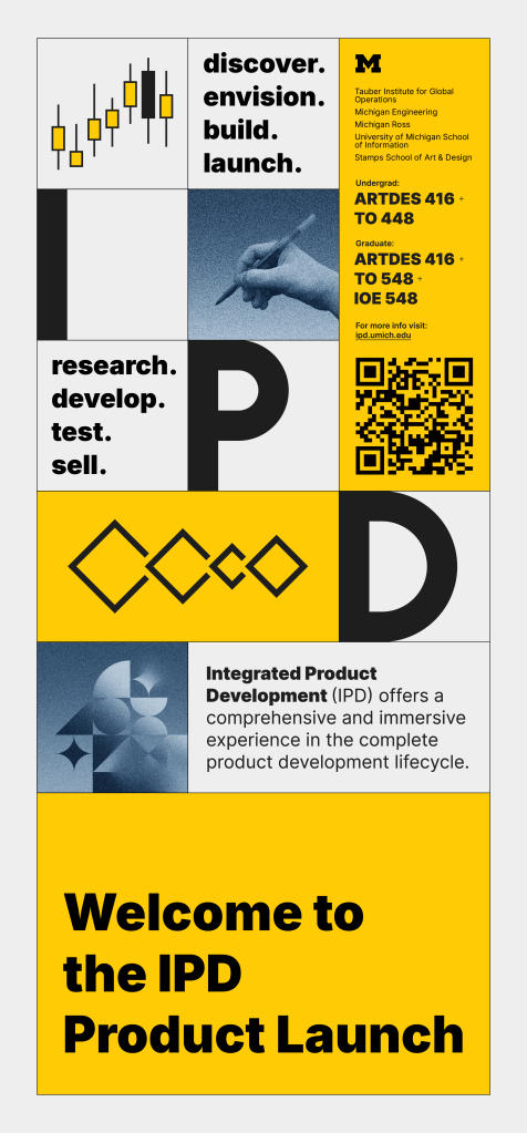 In addition to helping students in the Integrated Product Development course at University of Michigan as a teaching assistant, I also worked with the professors and my colleague and created a set of promotional materials for recruiting students and advertising the “Product Launch” public event. As a graphic designer, I created the course recruitment posters, as well as a template for future product launch that could adapt to each year’s theme. I communicated with the web designer of the team and provided necessary visual components. I also worked on course materials like voting sheets.
