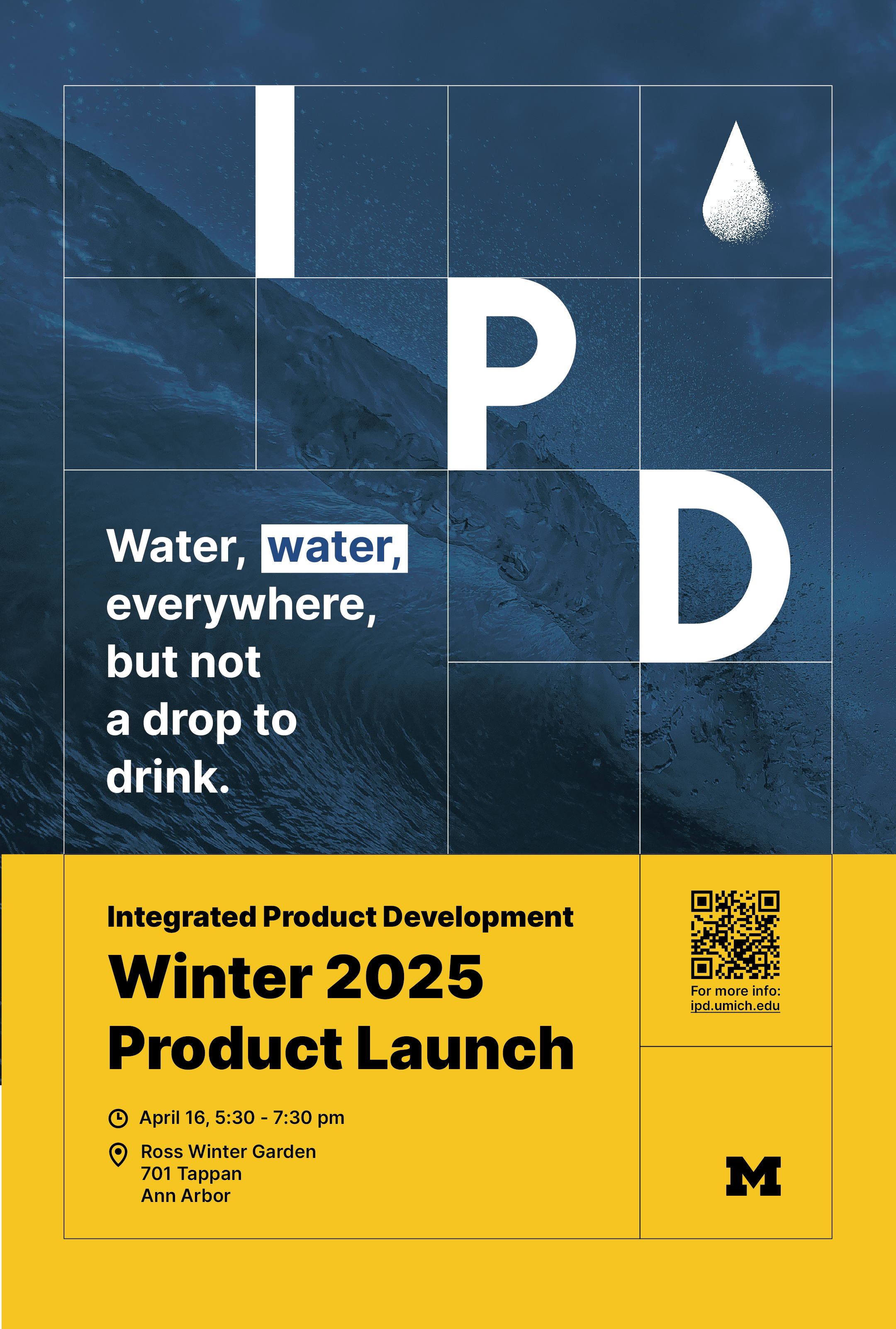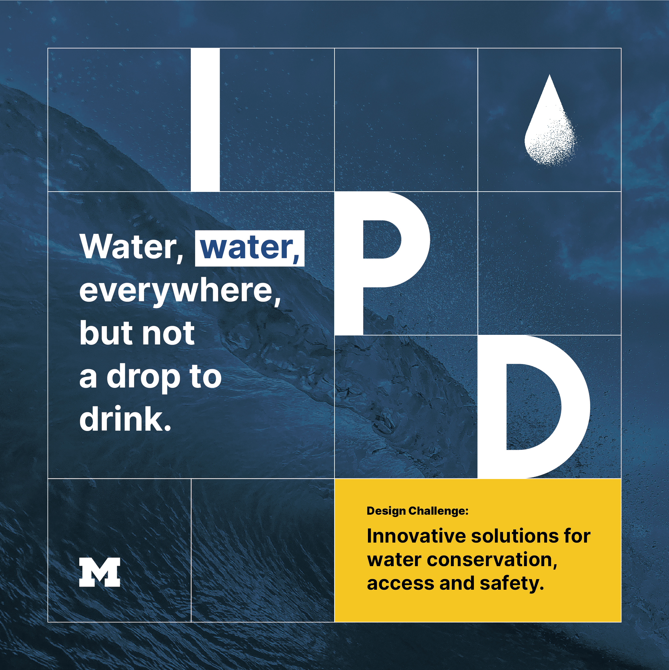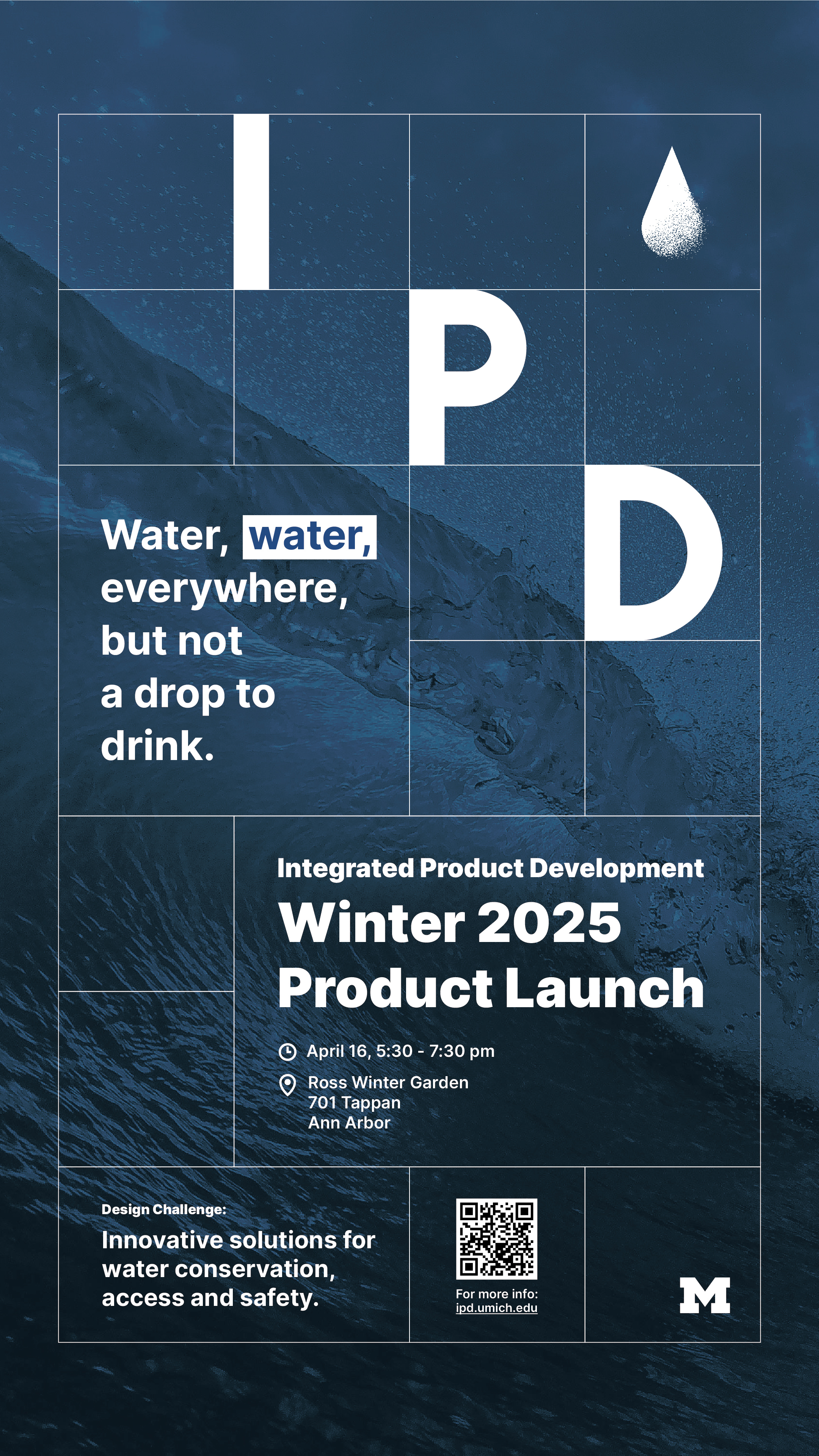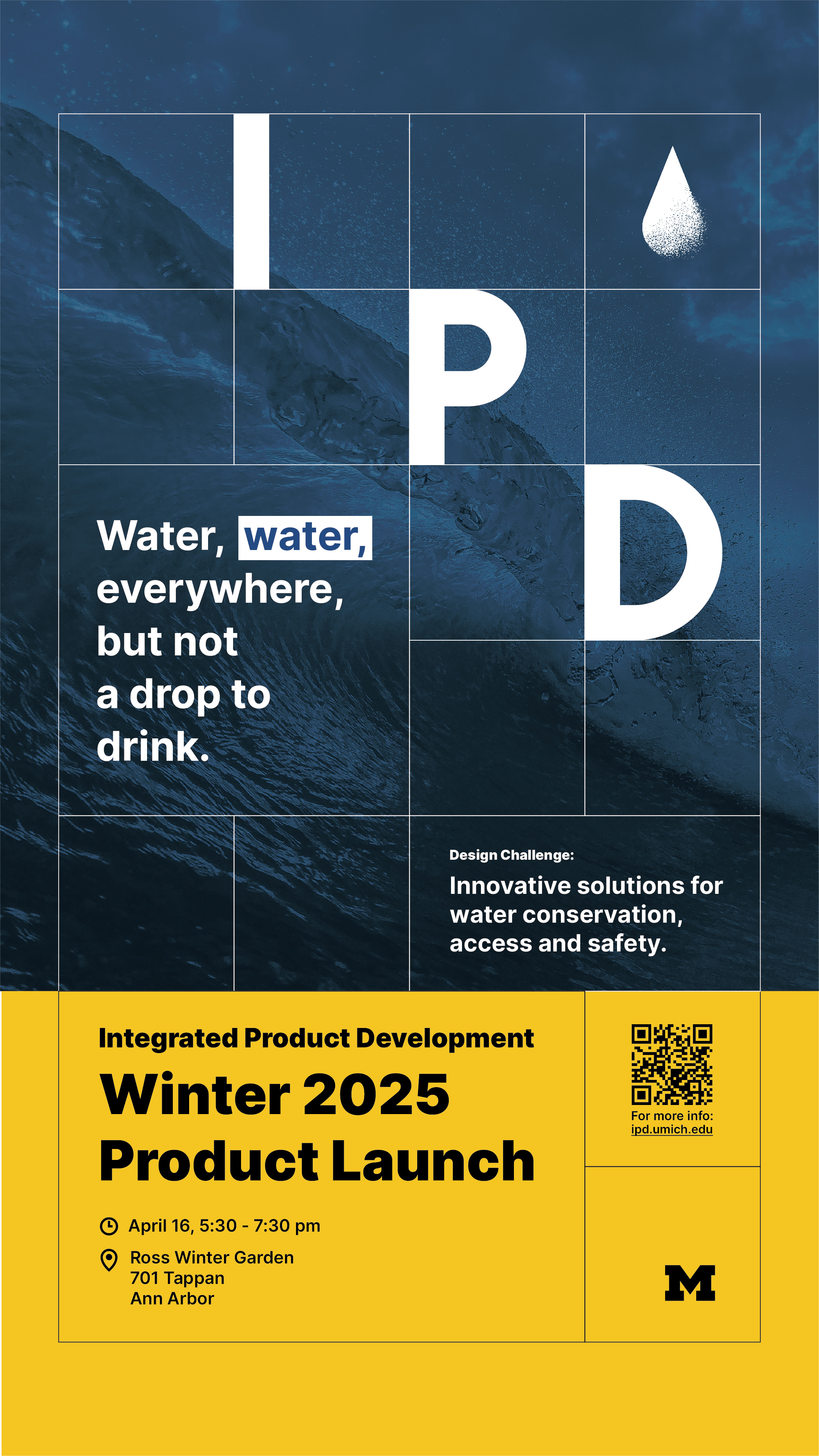 The design challenge, time, and location are the key information on the product launch poster. For example, the challenge of this year is close related to water, so I created a water drop icon, and the background is also related to water. In future years, new TAs could simply replace the background, icon, and text and get a new poster.