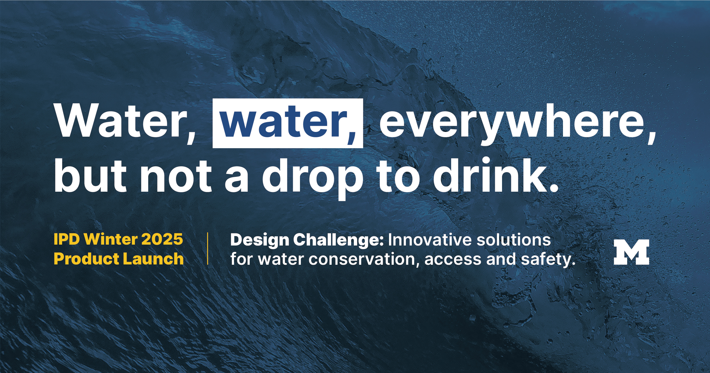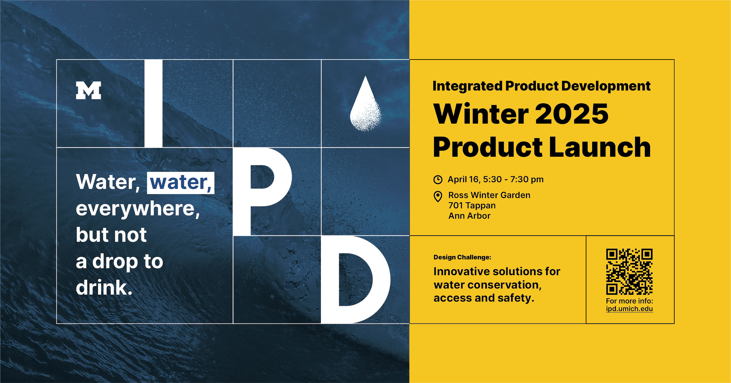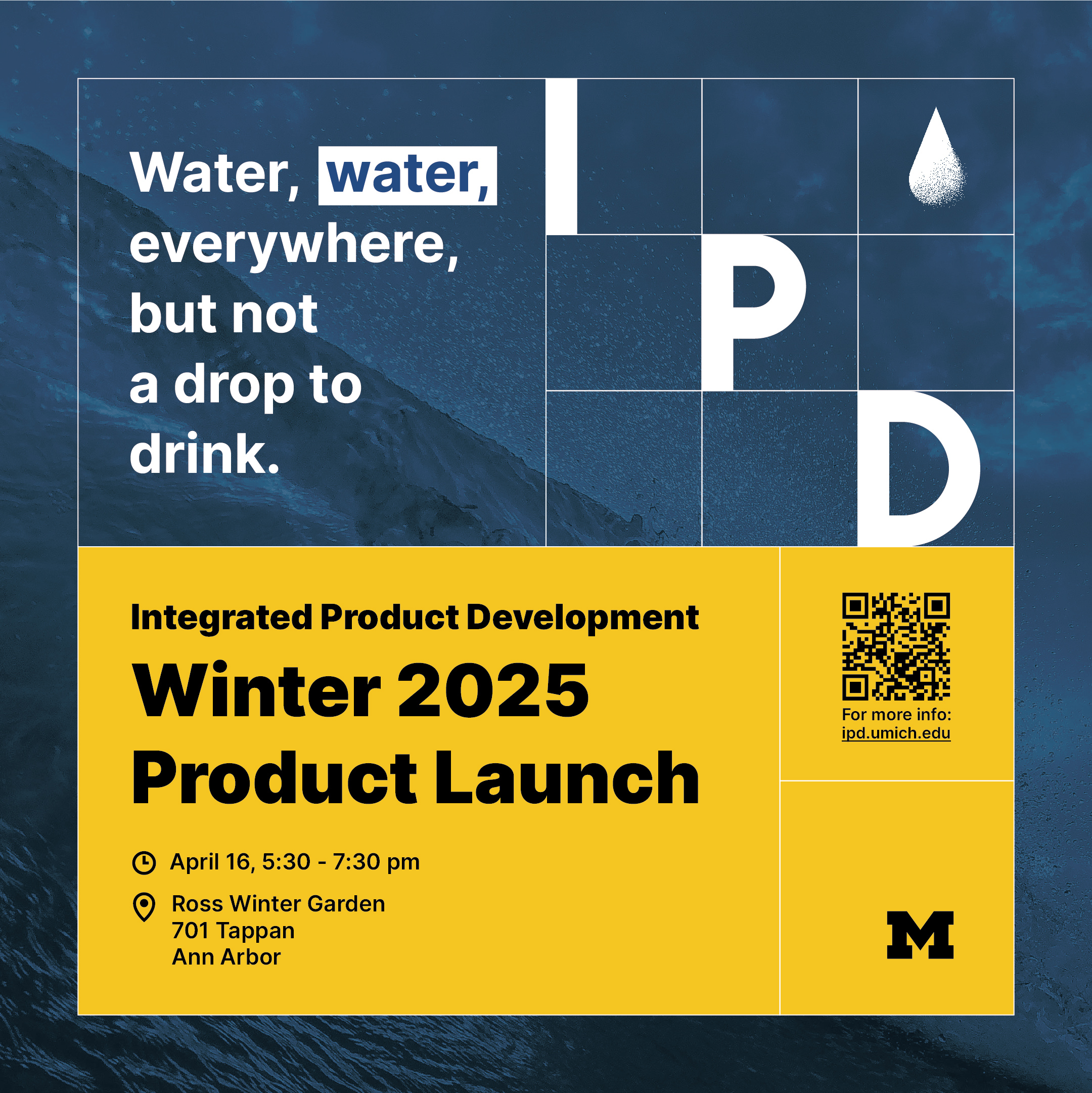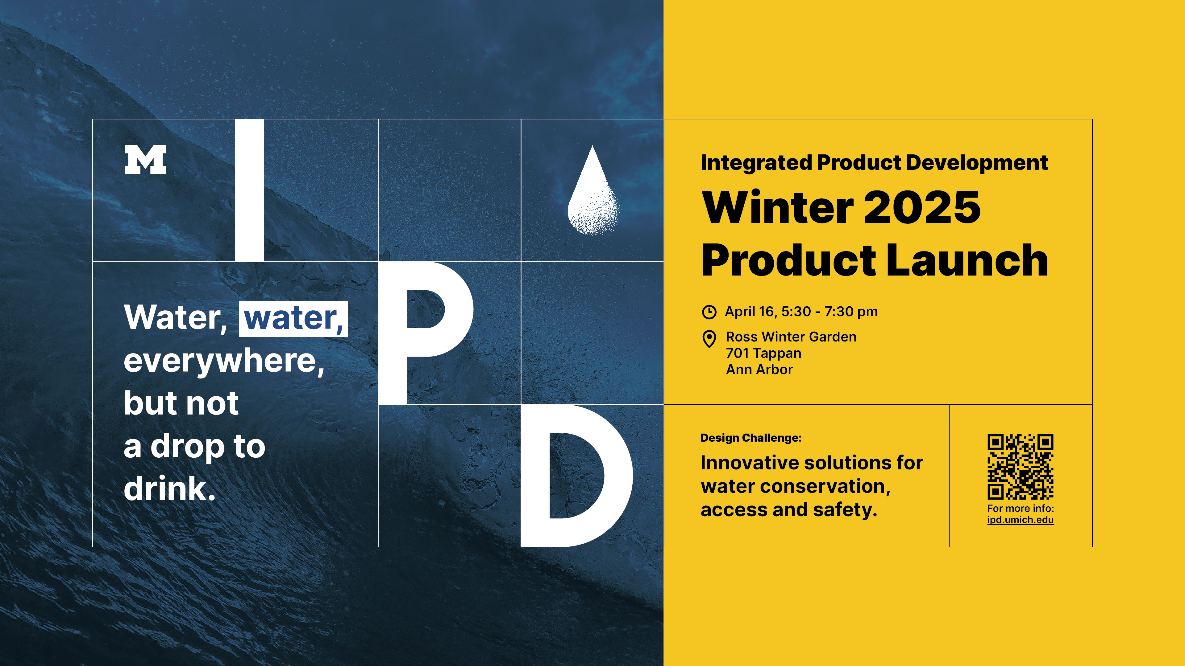 The design challenge, time, and location are the key information on the product launch poster. For example, the challenge of this year is close related to water, so I created a water drop icon, and the background is also related to water. In future years, new TAs could simply replace the background, icon, and text and get a new poster.