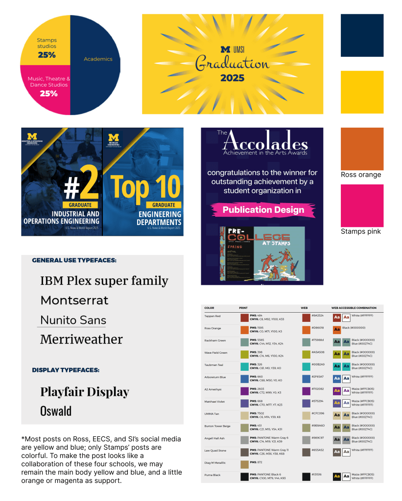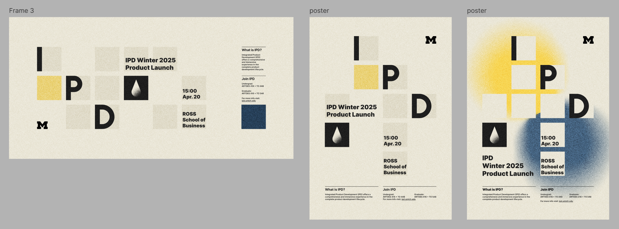 I chose gridline as the basic tone of the posters, because these squares could be easily rearranged and display on different platforms. The beige background represents the traditional draft paper color, implying the importance of sketching. the blue and yellow represent the color theme of UMich. I chose Inter as the primary typography, because it’s a modern font with a close relation with design.