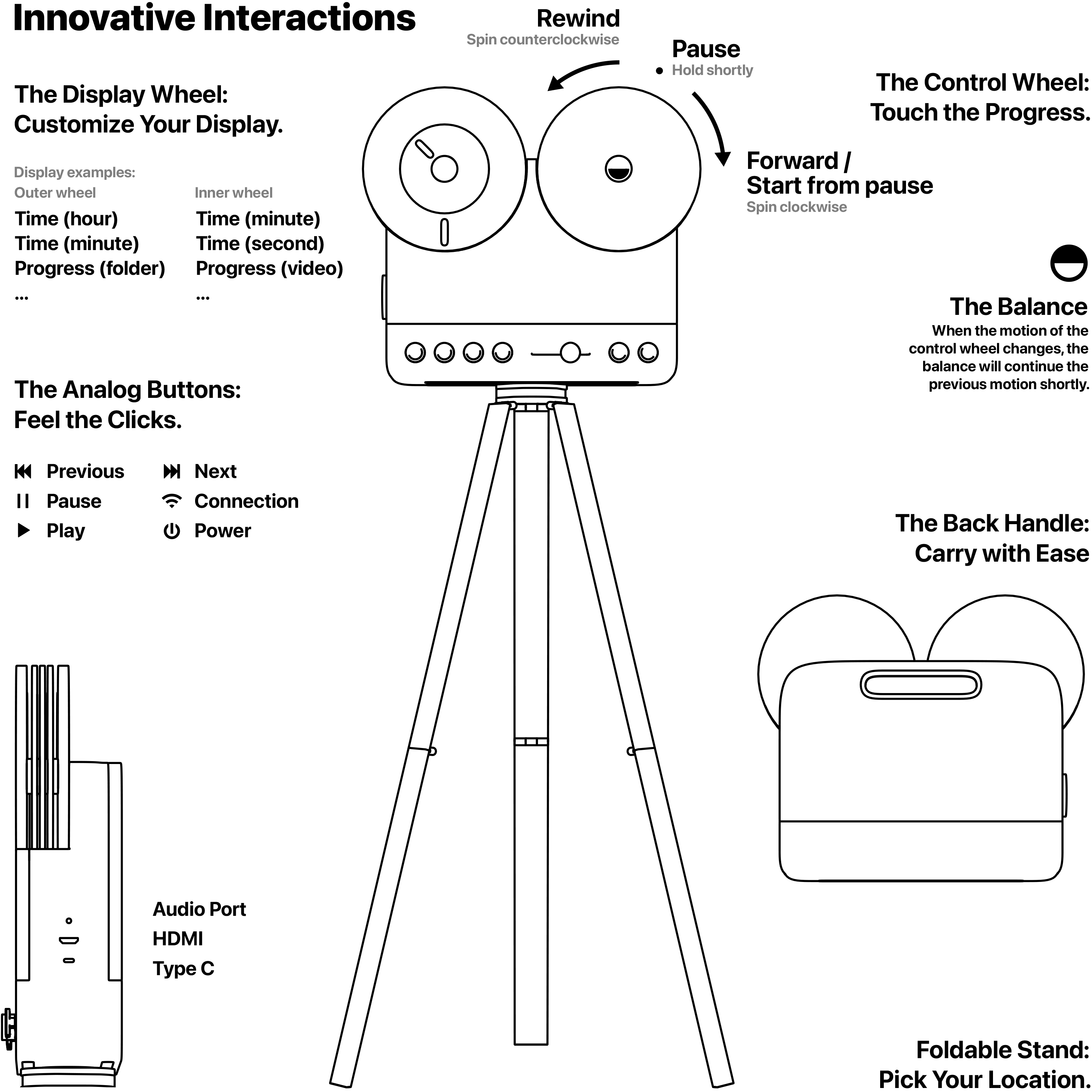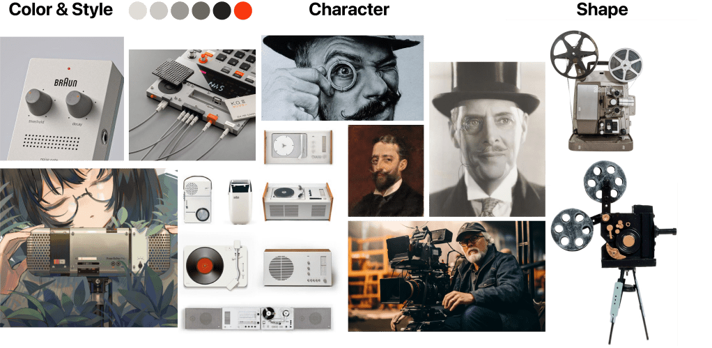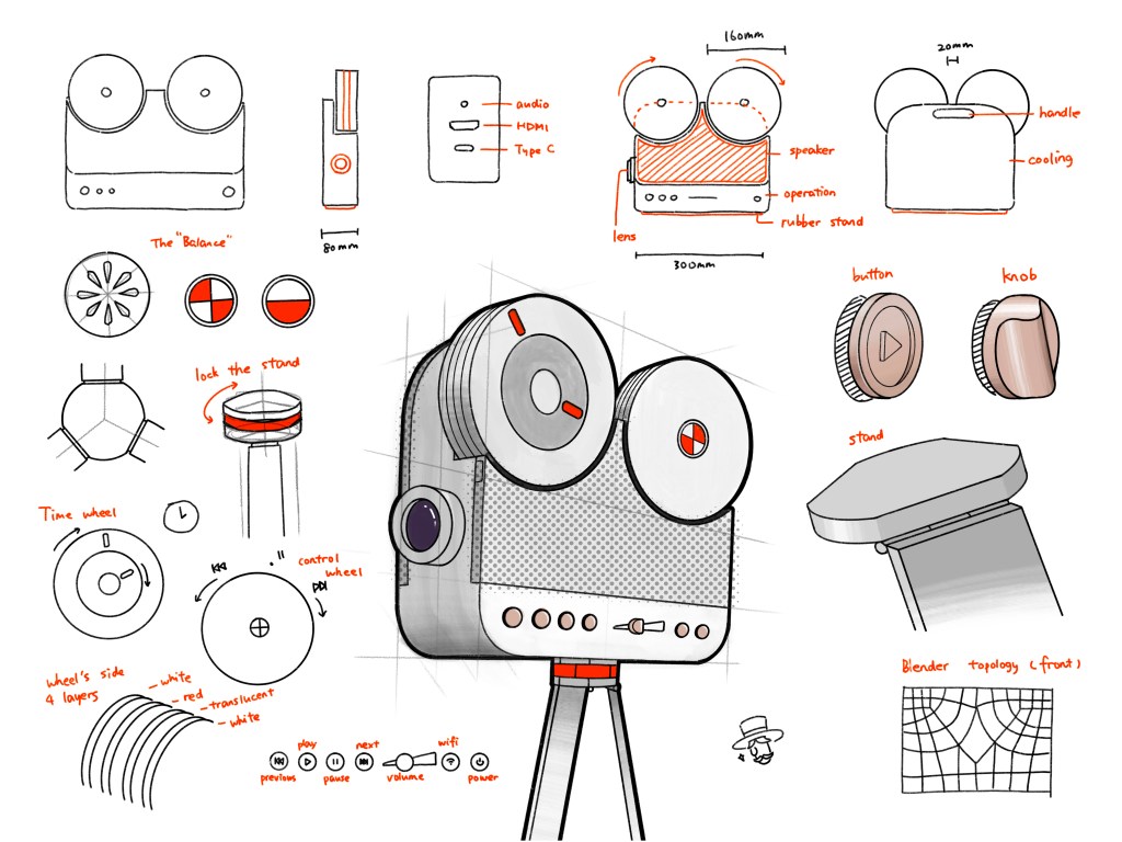 After playing Arknight’s event themed in the Space Race era, I was highly inspired by the visual aesthetics of modernism and decided to develop a project. I want to keep the outlines of old industrial products and give them new interactive operations. I also want to provide them with personalities and human names to emphasize the narrative aspect. The first piece of product in the series is a projector, inspired by the “old projector shaped” video icon in modern iconography system. There’s an interesting statement on the internet, saying the new generation born in the digital age will wonder why the icon of the “phone” app is a weird semi-circle with a hollow in the middle. Similarly, people who haven’t seen a old video camera will not understand why the video icon is designed like that, with two circles on a rectangle. I decided to design a projector in the shape of an old projector, but giving it new interactions.