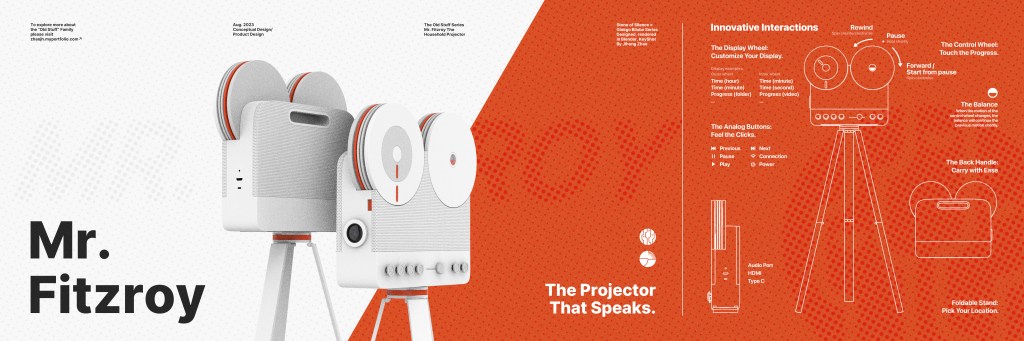 Mr. Fitzroy the Household Projector is an independent speculative product design, aiming to explore possible combinations of retro-styled film projector and a whole new operation logic. The two spinning disks on the left wheel represent the time of the film being played, and the right wheel represents the speed. Users can pause, play, speed up or even reverse the film by manipulating these wheels. This project was built with Blender. I harvested skills in topology and rendering through the process.