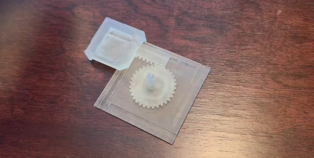 I 3D printed the model built in Blender with clear resin. To reduce the cost in time and money, I only printed the essential components including the base, the gear, and one drawer to test whether the drawer could move along the track and whether the teeth of the gear worked with each other. It turned out that I didn’t leave enough space between the track, so the drawer stuck in the track. I improved that in the second iteration.