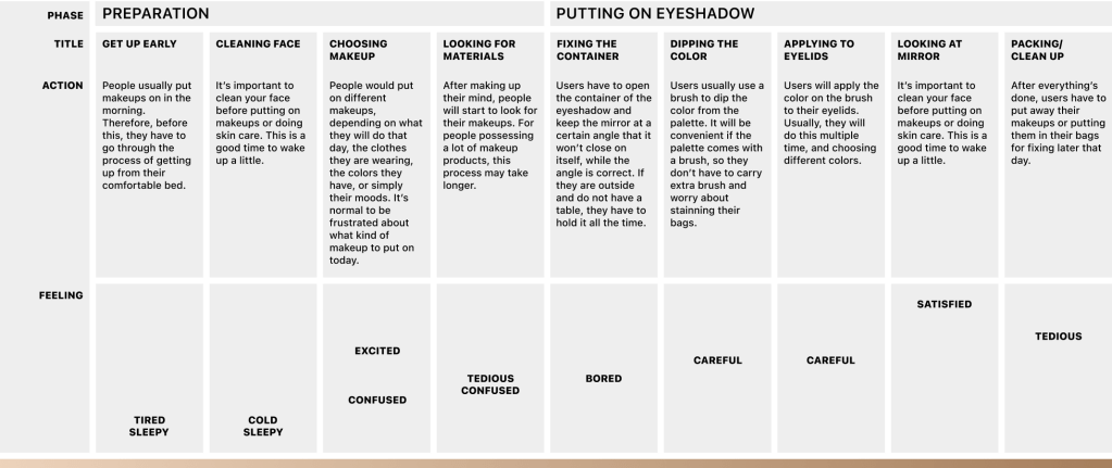 According to observation, more people with makeup needs tend to simplify the process of putting on their makeup, because a traditional makeup process is long and tedious. If the users simply want one layer of powder and eyeshadow, carrying the whole set of makeup is not necessary. Some people potentially want to try makeup but worry about the complex process and confusing choices in the market.