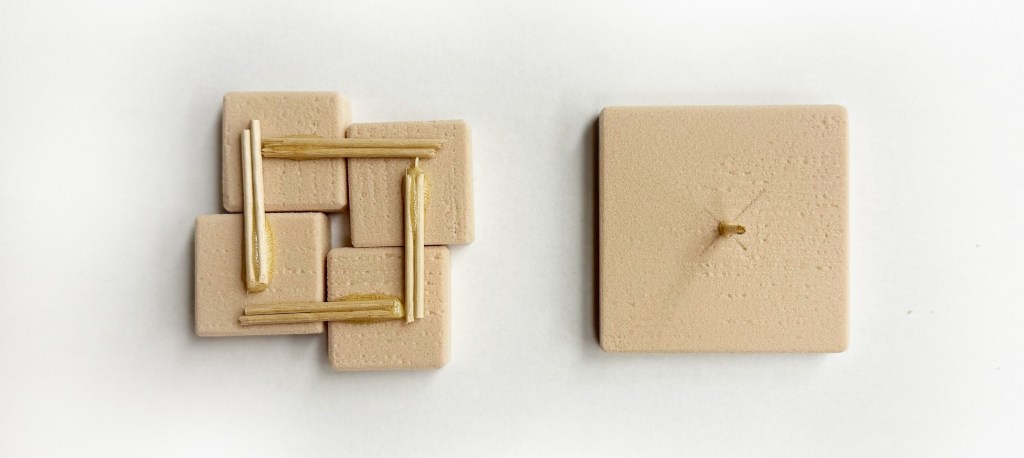 The first iteration of prototyping is made with toothpicks and model foam, mainly focusing on testing the dimensions of the product. The planned dimension was 60mm x 60mm x 20mm, and after the testing, it turned out that this was too small and couldn’t hold enough powder. Therefore, I increased the dimensions to 75mm x 75mm x 30mm in the final model.