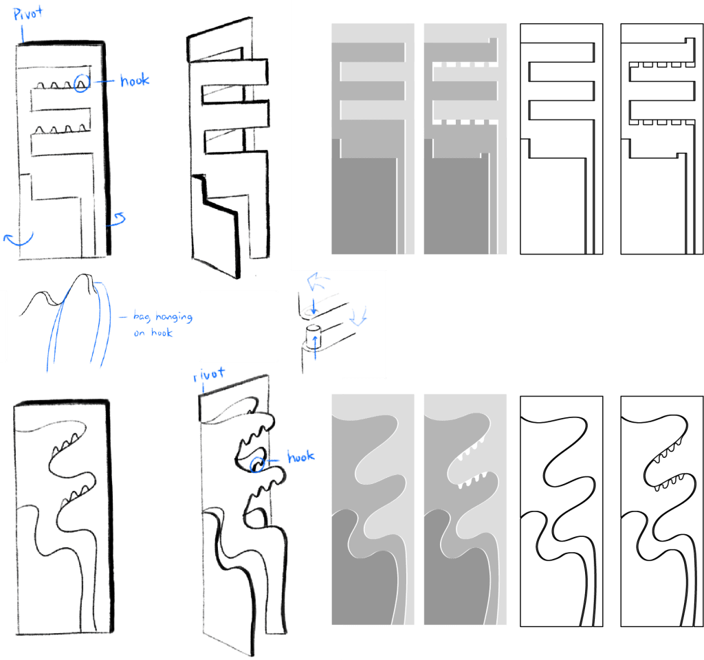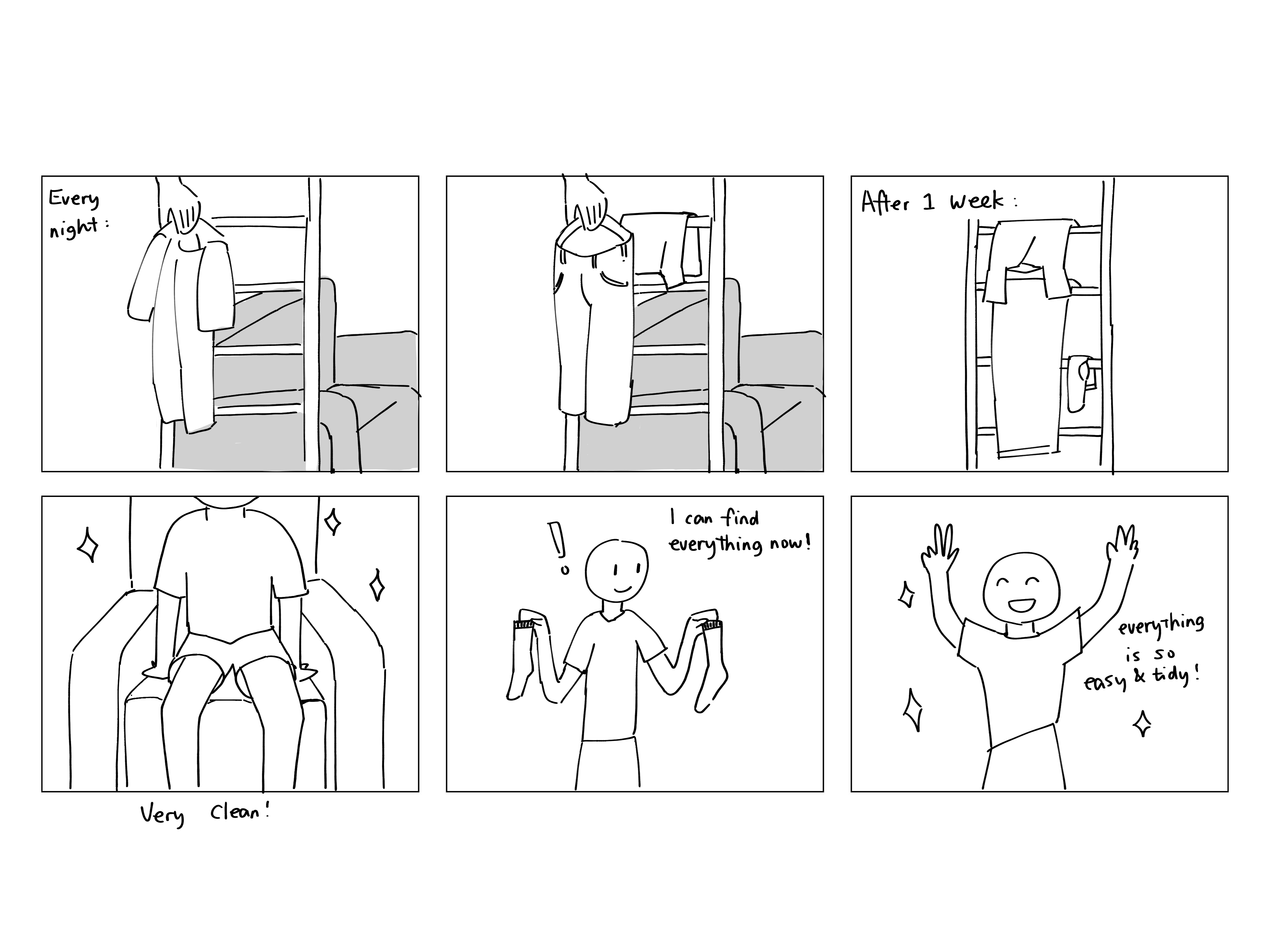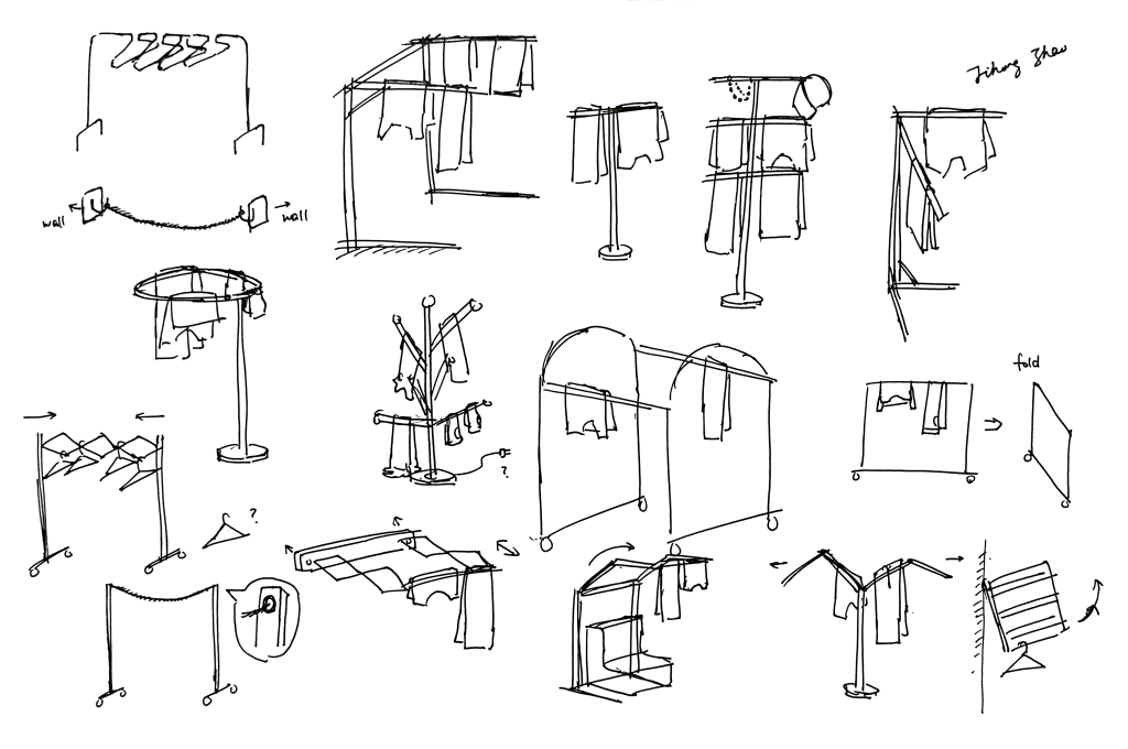 Based on the mood board and market research, I sketched several clothes organizing solutions that I thought could be easy for my target users to use.