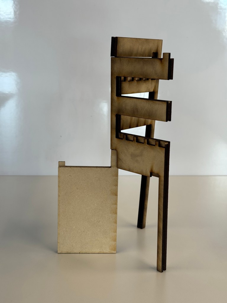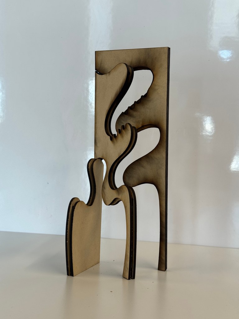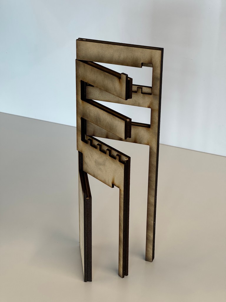 Finally, I chose a combination of the two visual styles, and added some modernism and Bauhaus element that I’m used to in the final CAD file. I laser-cut two layers of 1/8” MDF and glued them together. I used two 10” aluminum rods as the pivot.