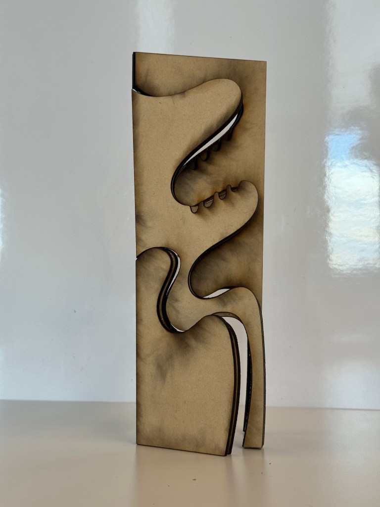 I sketched two versions, one with straight lines and one with curvy lines. I laser-cut two 6-inch models to test the opening and standing mechanism.
