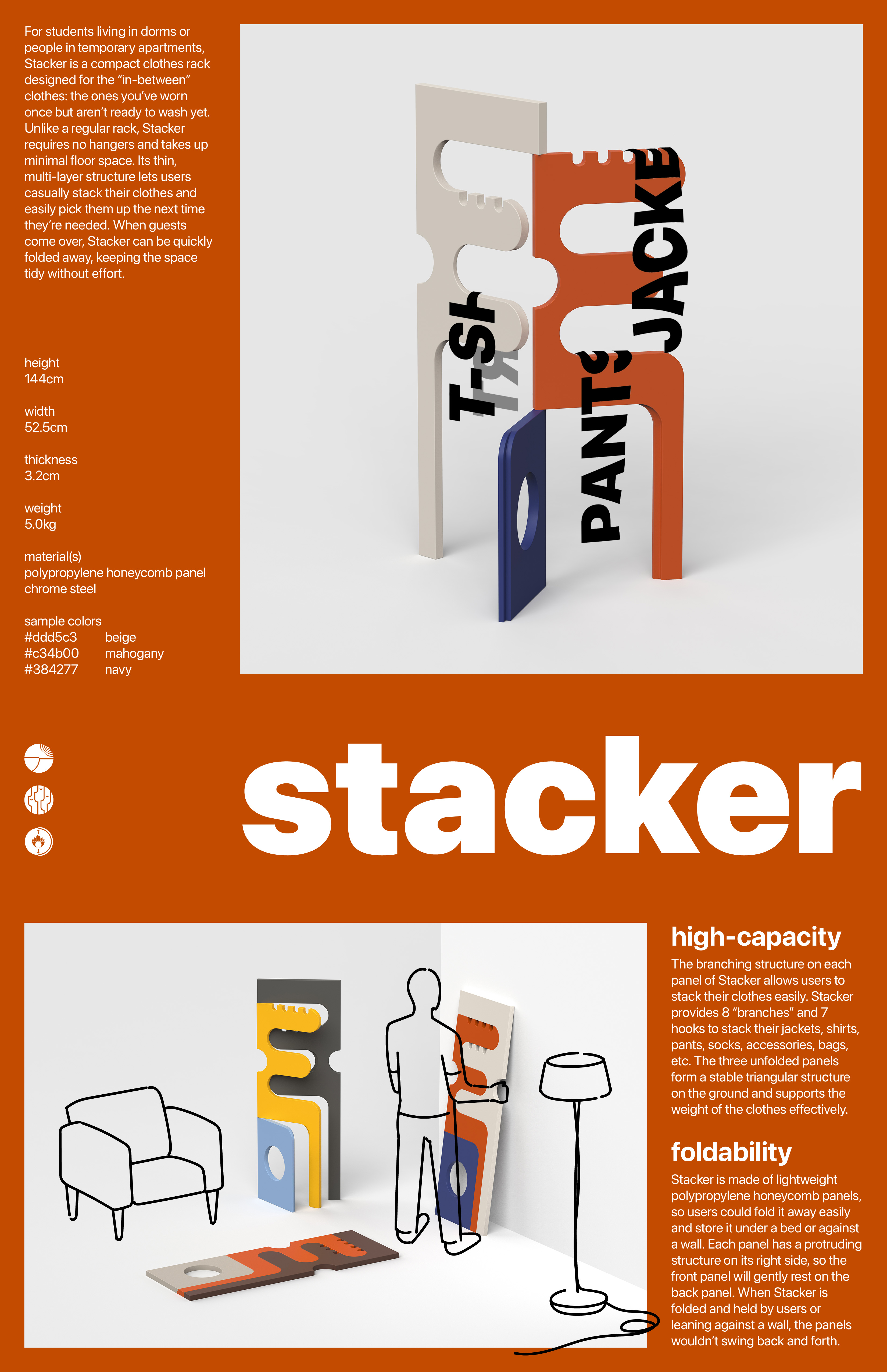 For students living in dorms or people in temporary apartments, stacker is a compact clothes rack designed for the “in-between” clothes: the ones you’ve worn once but aren’t ready to wash yet. Unlike a regular rack, Stacker requires no hangers and takes up minimal floor space. Its thin, multi-layer structure lets users casually stack their clothes and easily pick them up the next time they’re needed. When guests come over, Stacker can be quickly folded away, keeping the space tidy without effort.