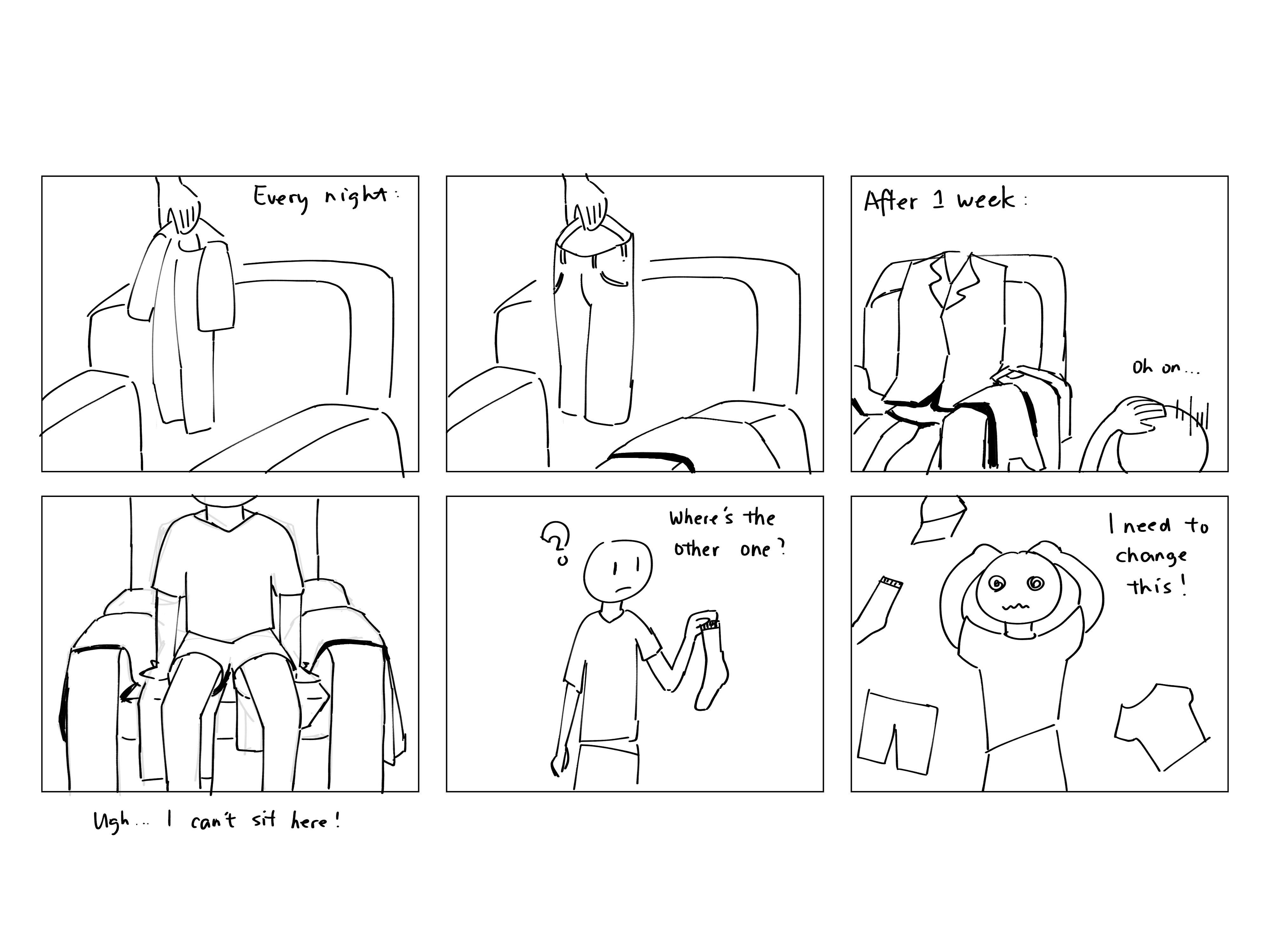 According to my observations and interviews, a lot of students living in dorms or single apartments lack the motivation to fold or hang clothes all the time. For those clothes they only wear once that are not yet to be washed or put back into the closet with the clean clothes, these students tend to throw them on a chair. These clothes will stack on each other, and the chair will become unable to sit on the few days before laundry. To solve this problem, I want to develop an affordable, space-saving, easy to use clothes organizer.